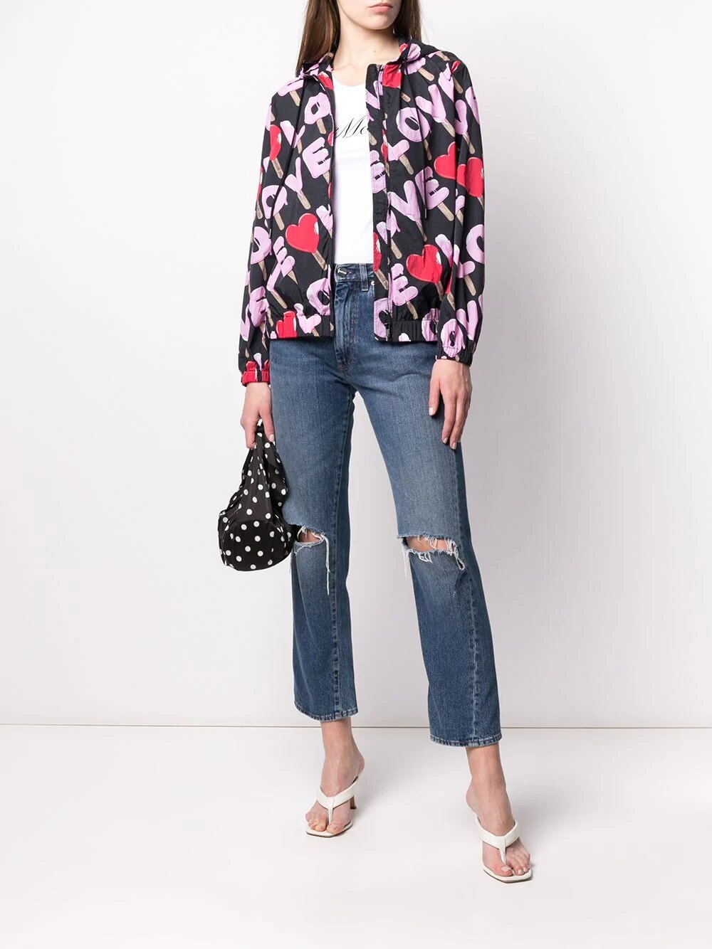Chaqueta impermeable con estampado de helados LOVE MOSCHINO con capucha con cierre con cordones, cierre con cremallera en la parte delantera, manga larga, dobladillo elástico y remates elásticos.