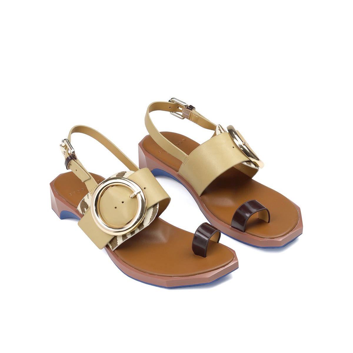 Sandalia toe-loop 4CCCCEES FOLLIN TORUS ZEBRA MIX. Piel de vaca, estampado zebra, hebilla dorada, tacón 35mm. Tallas 36-41.